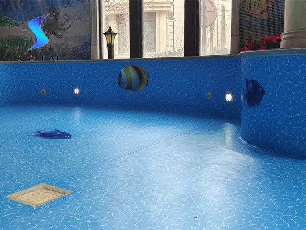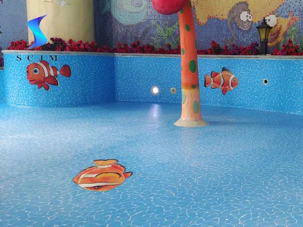 本項目位于北京市,為室內戲水池,原基礎為馬賽克瓷磚,裝修改造更換泳池膠膜,表面附有海洋生物圖案膠膜,整體效果如下: